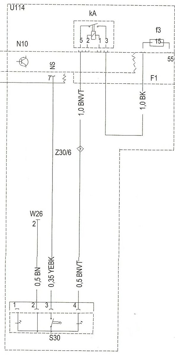 Dies führt dann in der ZEE dazu, daß das Relais A angesteuert wird, siehe auch diese Seite!Und über die Sicherung 3 mit 15 Ampere, siehe jene Seite, bekommt der Arbeitskontakt des Relais seine Spannung, die er dann auf die Nebler bzw. auch den Pin 4 dieses Schalter schaltet, damit der eingeschaltet Zustand signalisiert wird.