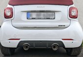 Hallo, ich habe seit gestern die Fox Abgasanlage (2 x 100mm - mit Brabus Diffusor-Blende) an meinem Smart. Der Verkäufer hat auf meinem Hinweis das der Kleine Chiptunig hat, mir eine "Leisere" Fox Anlage - für den 453 mit Leistungssteigerung verkauft.