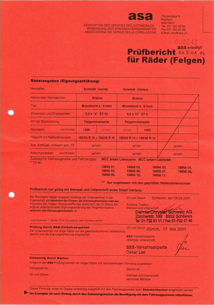 Was mich dabei irritiert ist, daß auf dem roten Blatt mit dem asa Prüfbericht für Räder Schmid als Hersteller angegeben ist.