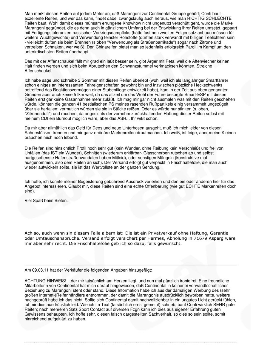 Die Makkaroni waren tatsächlich unterirdisch, neu schon kacke, nach einem Jahr unfahrbar. Insbesondere auf dem Smart nicht mehr akzeptabel, das war nicht übertrieben. Gekauft hatte ich sie weil sie einfach eine geile Optik hatten und mit dem Contibezug geworben wurde - welcher tatsächlich vom Conti-Öffentlichkeitsresort weit von sich gewiesen wurde.
