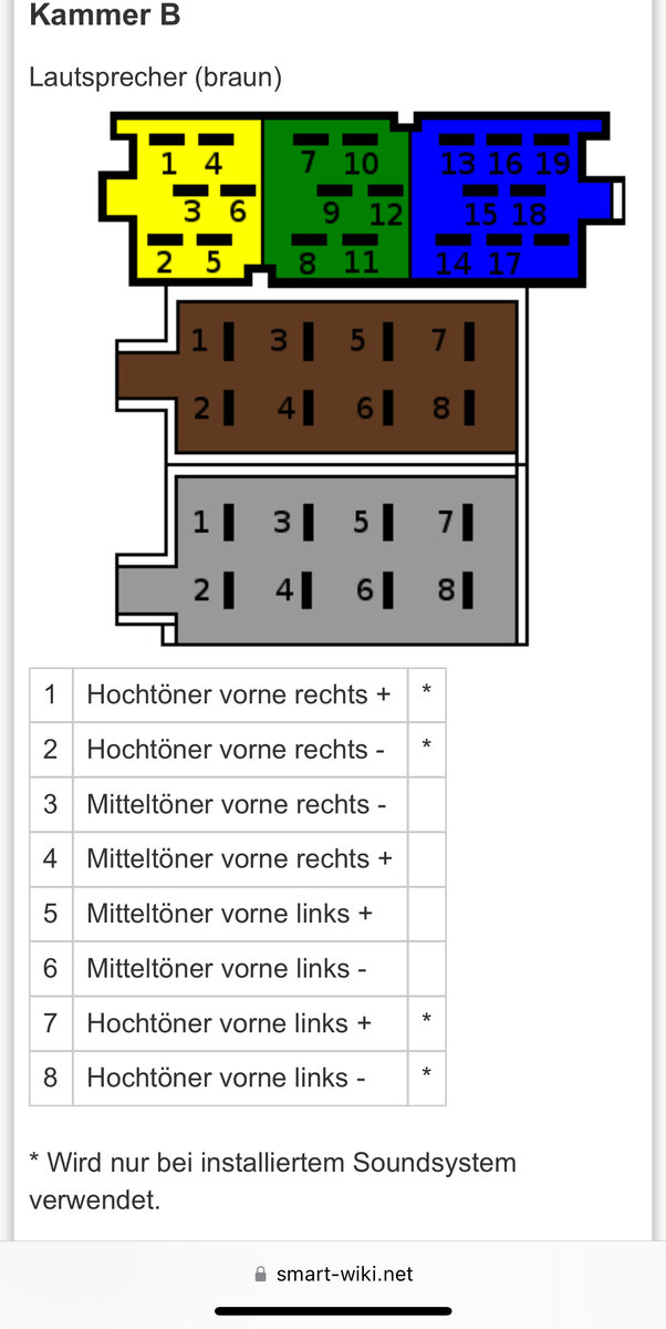 Dann habe ich wie bei Smart Wiki beschrieben auf die belegten Stecker (braun) 3,4,5,6 geschaut und nach Farben rechts, links + und - verbunden.