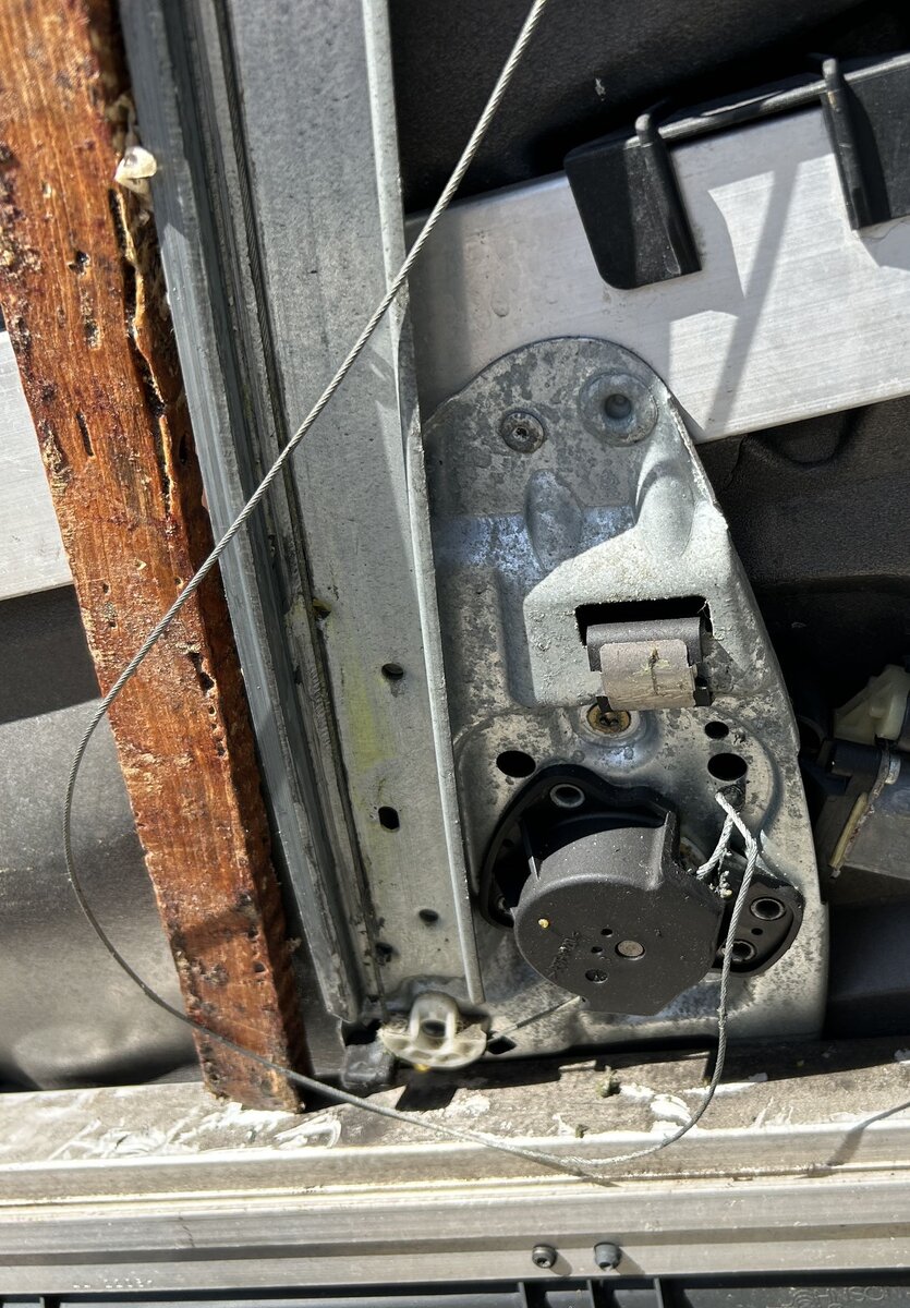 Bowdenzug ist nicht gerissen, sieht aber übel aus. Gummiführung der Scheibe Richtung Heck ist beschädigt, Scheibe war neben der Spur, muss neu?