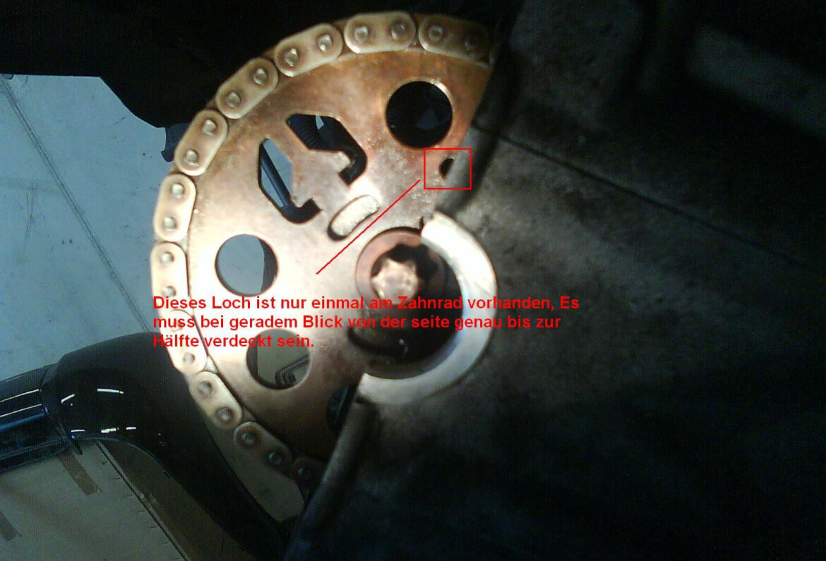 Wenn das Loch nur halb zu sehen ist auf der linken Seite, dann ist die Kette gelängt. Da sie von links gespannt wird und wenn sie dann etwas länger wird mit der Zeit wandert das Loch nach unten. Da die rechte Seite eine feste Gleitschiene hat und da sich die gelängte Kette von der Stecke rechte Seite Kurbelwelle zu rechte Seite Nockenwellenzahnrad länger wird.