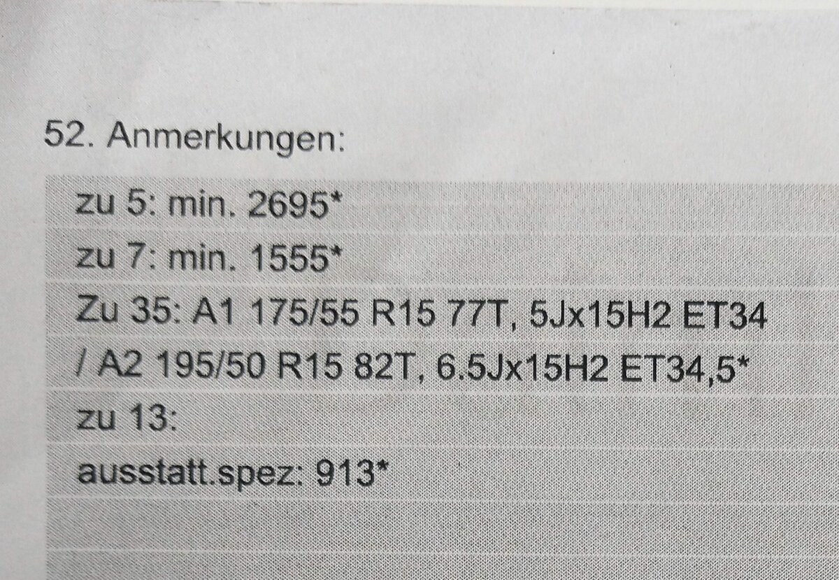 Zu den Umbauten gibt es ein Gutachten (in Schein und Brief steht aber nichts dazu) und dort ist lediglich die Reifen/Felgen-Kombi eingetragen, wie sie jetzt drauf ist (wurde übrigens vom letzten VK auch nur so gefahren und nie geändert, d.h. im Moment sind Winterreifen drauf).