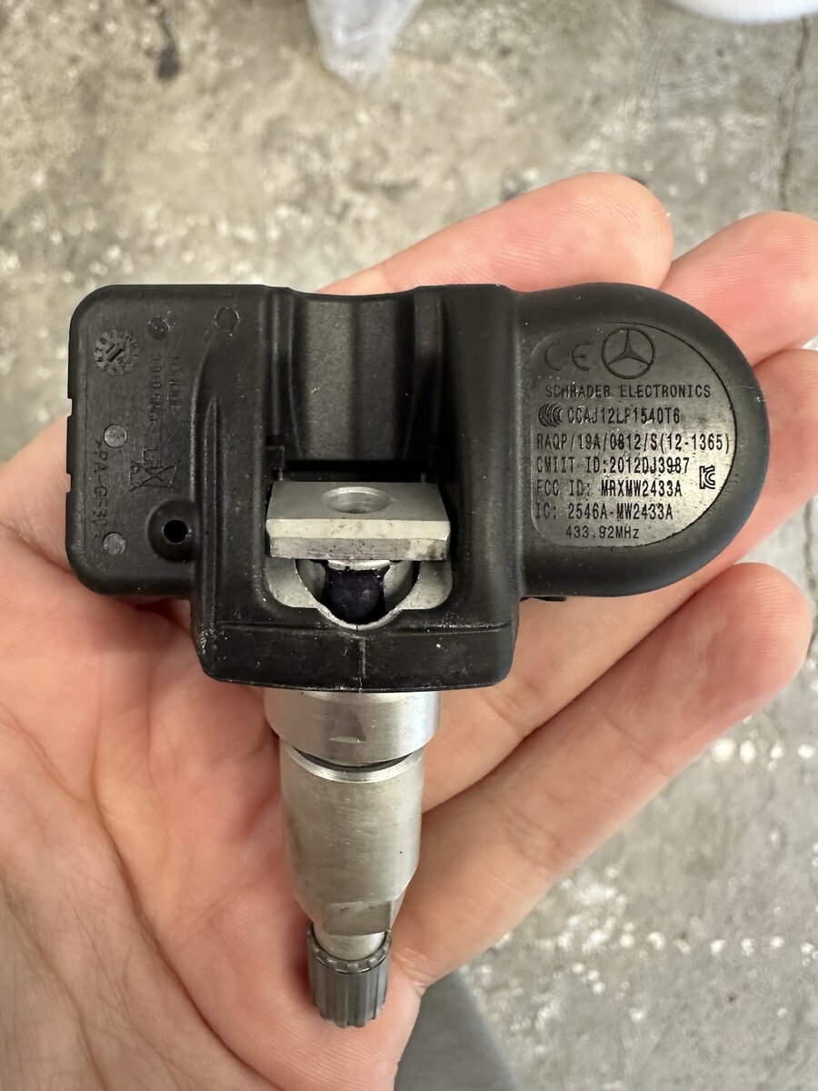 Der originale Sensor sieht wie folgt aus und wurde von Schrader für Mercedes-Benz gefertigt. Schrader listet als Alternative für A0009057200 das Modell 3013, welches online ab knapp 25€ zu haben ist, also habe ich diese bestellt. Montiert sehen beide identisch aus und nach Reset des Reifendruckkontrollsystems bleibt die gelbe Lampe aus.
