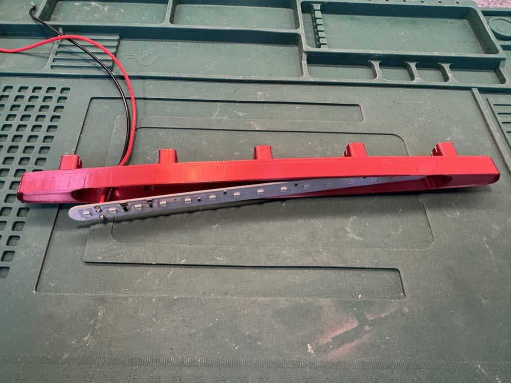 Die Kabel durch den gedruckten Einsatz durchziehen, die Platine einlegen und den Reflektor einklippsen. Anschließend die Kabel an die Metallschienen anlöten und die Schienen mit einem Hammer in die Aussparungen einschlagen. Dabei darauf achten, dass die Schiene in dem mittleren Steg genau mittig eingeschlagen wird (siehe Bild), ansonsten passen die Kontaktstifte nicht mehr in den Spoiler. Der linke Kontaktstift ist Minus (schwarzes Kabel anlöten), der rechte ist Plus (rotes Kabel anlöten). Die Polarität nicht vertauschen, ansonsten funktionieren die LED's nicht und bleiben dunkel.