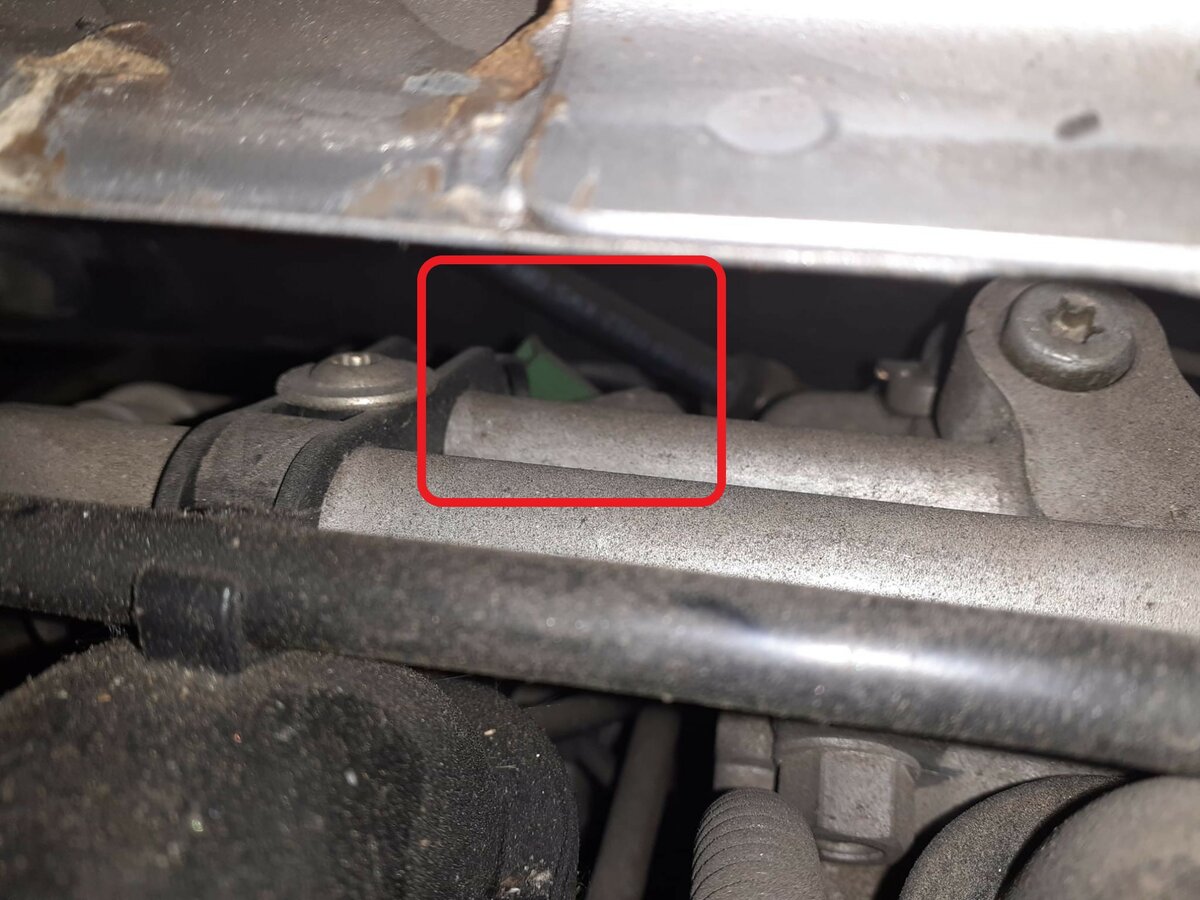 Die Klimaleitungen kommen ja als flexible Schläuche vom Wagenboden und gehen dann in starre Rohre über, die dann weiter zum Klimakompressor führen. In dem unteren der beiden Rühre sitzt dieser Druckschalter, ich habe den Bereich auf dem Bild mal mit einem roten Rahmen versehen. 😉