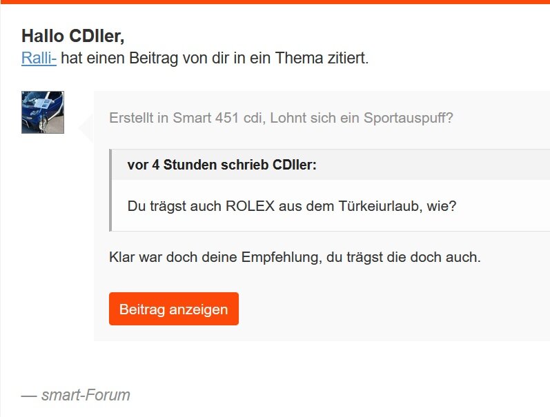 Schmörty Geschrieben am 28. September 2025 Hallo zusammen, Ich habe vor einiger zeit mal drüber nachgedacht ob es nicht lustig und erlaubt wäre bei meinem Smart cdi ein Sportauspuff einbauen zu lassen. Mir ist klar das es nich annähernd so geil klingt wie bei nem Benziner. Aber vielleicht wertet es den Sound ja etwas auf, kenn mich damit leider nicht so wirklich aus. Weiss aber auchnicht ob es sowas für nen CDI überhaupt gibt. Hat da jemand schon erfahrungen gemacht und kann mir diese mitteilen? Diesen Beitrag teilen Link zum Beitrag Auf anderen Seiten teilen